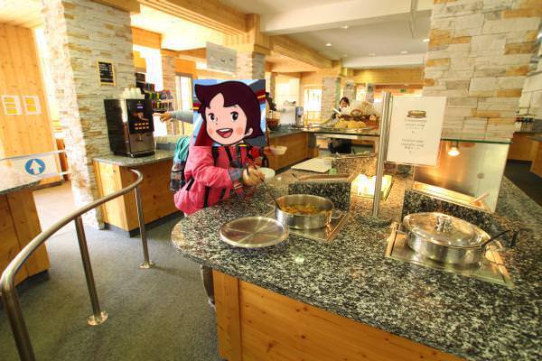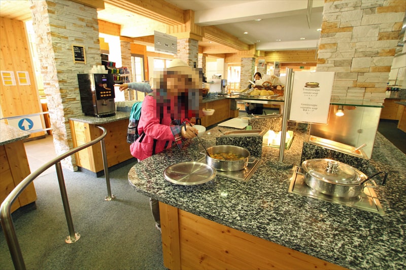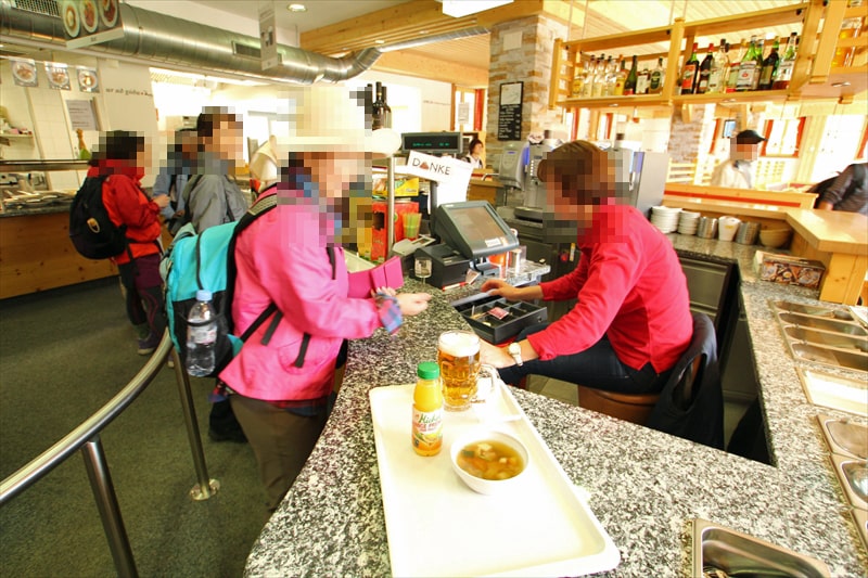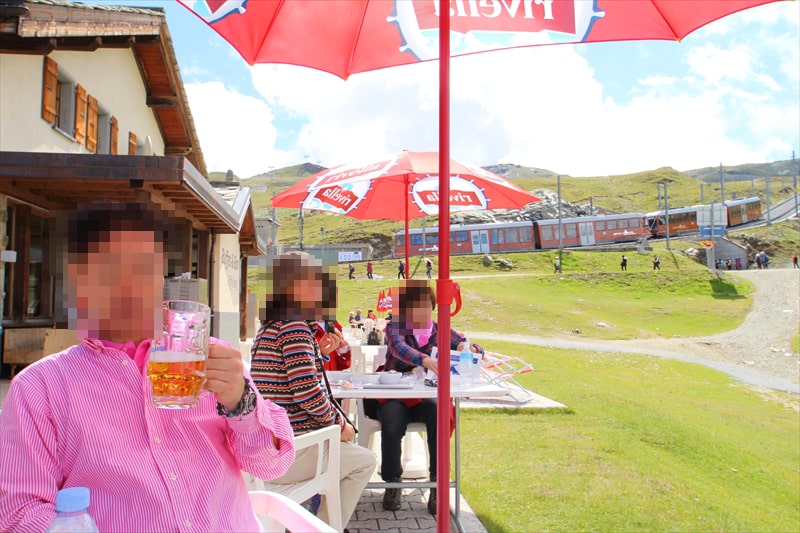 当日のお昼はツアーではおにぎりとリンゴなどのお弁当だったのですが、リッフェベルクの駅のすぐ横にあるビュッフェ&バー リッフェルベルグというレストランで少しでもオーダーすれば席が利用できるとハイキングガイドの方に言われましたので、ビールやジュース、野菜スープなどを購入してテラス席でランチタイムとしました。