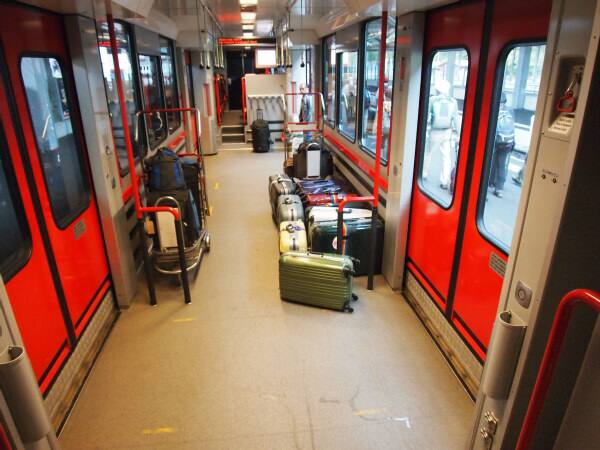 テーシュの駅前でバスを降り、スーツケースなどの荷物は自分で持って電車に乗ります。