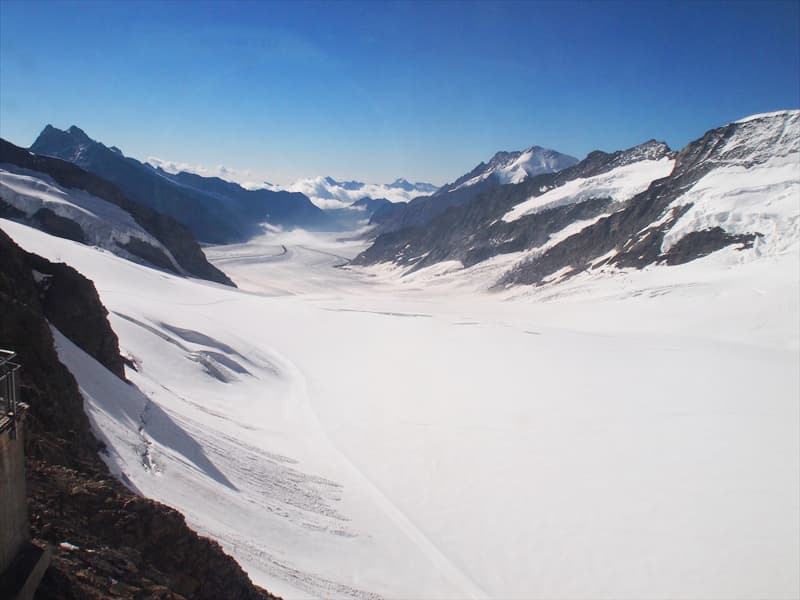 晴天時には360度の大パノラマを楽しむことができ、アルプス最大で全長約23kmの世界遺産のアレッチ氷河は氷河のうねりがはっきり見える圧巻の景色となっています。